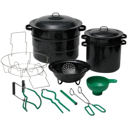 12 piece set.Domed lid lures heat for faster boiling.Durable porcelain enamel-on-steel development.Heats speedy and efficiently.Safe to use on gasoline and electric range tops...Granite Ware 0719-1 Enamel-on-Steel Canning Kit with Blancher, 12-Piece Features.